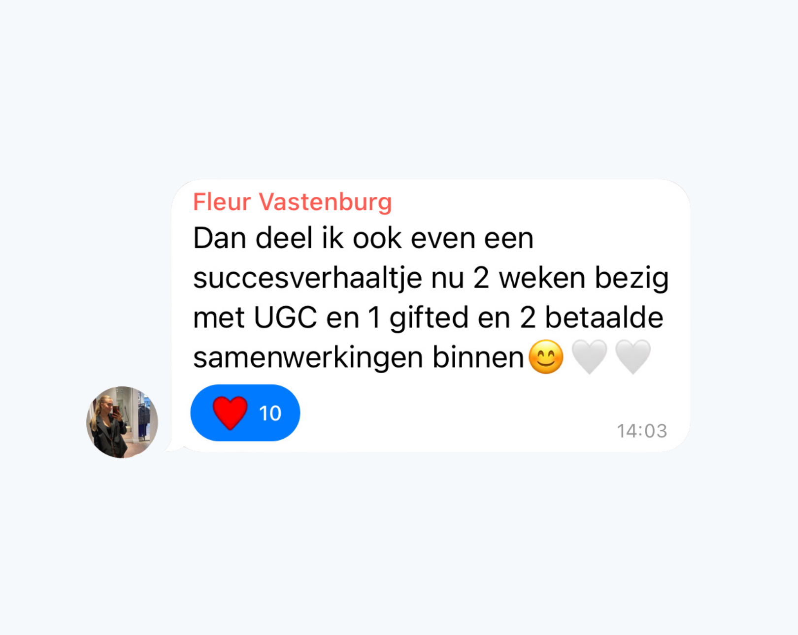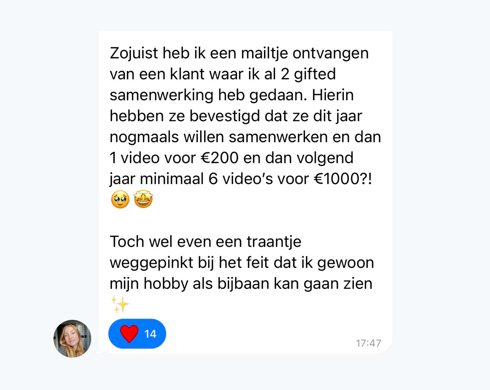 "Ik heb vorige week eindelijk echt de tijd genomen om mij te focussen op UGC. Vandaag heb ik m'n eerste samenwerking binnen en gelijk een deal van €1.300!"